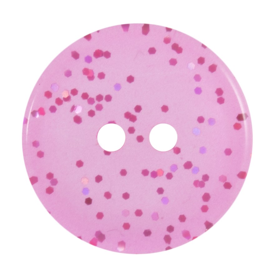 Button 15mm Glitter 2-hole. Pink Transparent finish with silver glitter. 100% polyester. Washable at 40 degrees centigrade. Sold singly